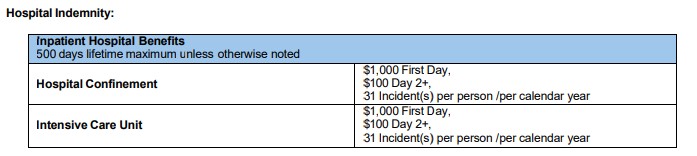 - Pays benefits for hospital admissions and confinement (regular & ICU): This could be for any reason – Sickness, Injury, Pregnancy, COVID, etc.